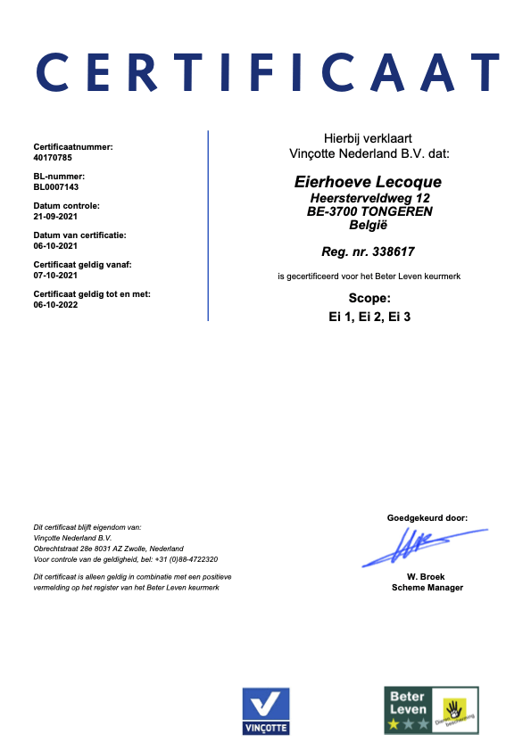 Onze eieren zijn afkomstig van pluimveehouders die niet alleen voldoen aan de strengste overheidsnormen, maar ook aan de criteria van Lecoque eggs.
